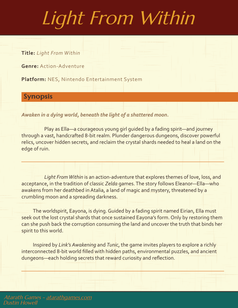 Welcome to the official press kit for Light From Within, a narrative-driven NES action-adventure from Atarath Games. Below you’ll find downloadable assets, trailers, and logos formatted for media use.